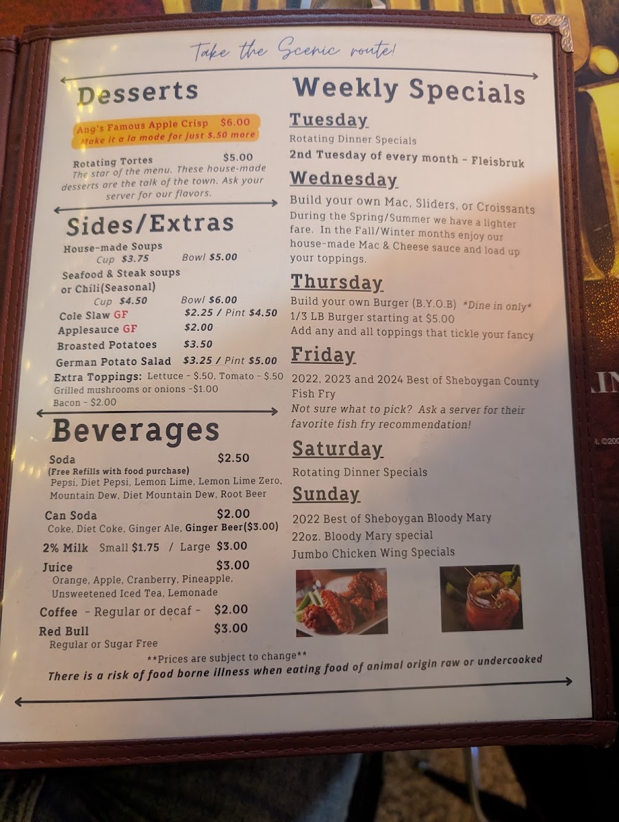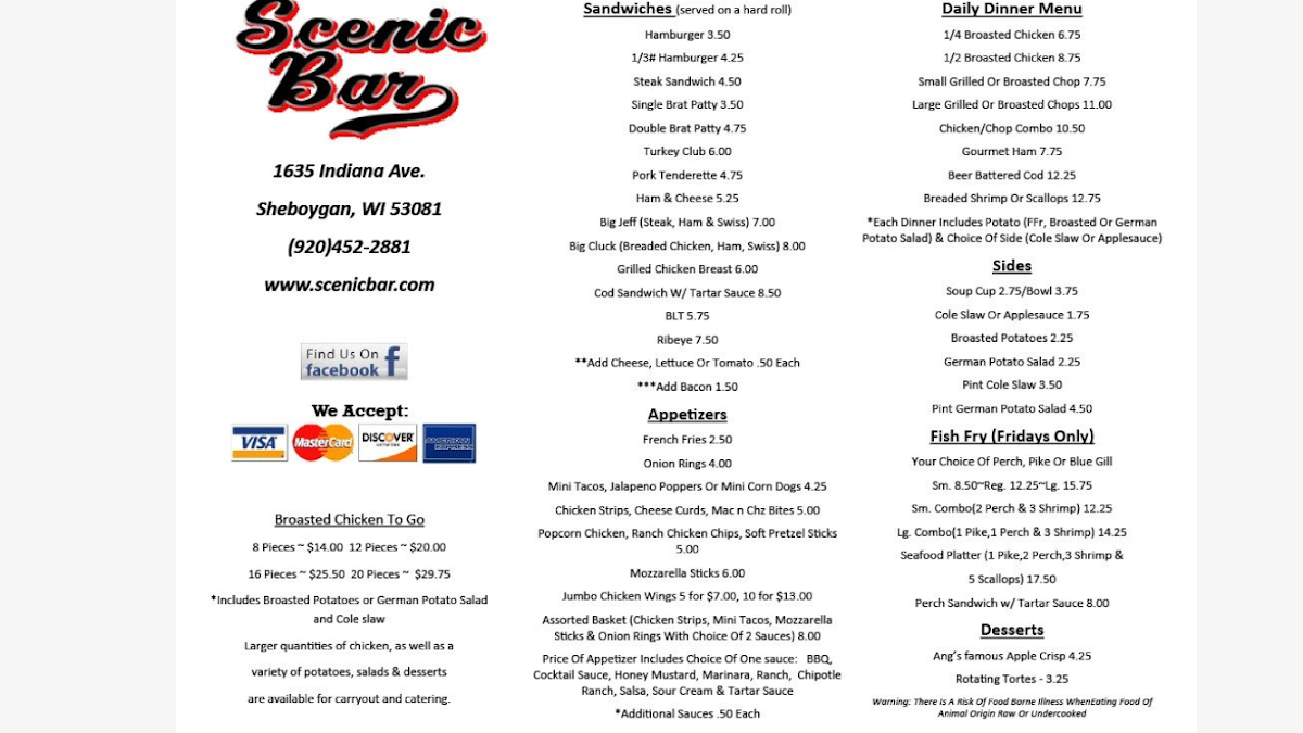 Take a look at the Scenic Bar & Restaurant Menu and you’ll quickly see it’s built for anyone who loves hearty comfort food with a little extra flair. Tucked away at 1635 Indiana Ave in Sheboygan, this spot keeps things relaxed but never boring. The menu moves easily from classic bar favorites to satisfying dinner plates, so whether you’re stopping in for a casual bite or settling in for a full meal, there’s something that fits the mood.