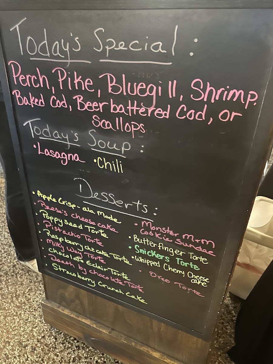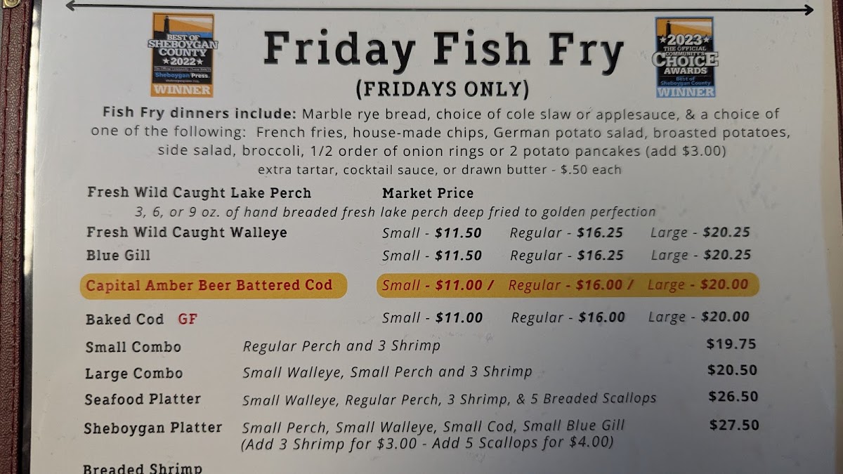 Two 4 ounce pieces of fresh cod baked to perfection. Served with marble rye bread, choice of side, cole slaw or apple sauce and tartar